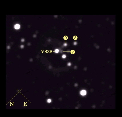 Bei den meisten Sternen der Aufnahme handelt es sich um Vordergrundsterne. Aber eben nicht alle. Der schwächste der Clustersterne weist eine Helligkeit von V ~16 mag auf. Die beiden anderen bewegen sich im Bereich von 14 bis 15 mag. Der größte Abstand (in Projektion) zu V838 beträgt 45" (1,3 pc). Die Entfernung des Clusters wurde zu ~6 kpc bestimmt.