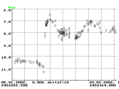 Wegen der geringen Maximalhelligkeit von 13mag nahm in den letzten Jahren kein Beobachter der BAV an der Überwachung dieses Sterns teil.