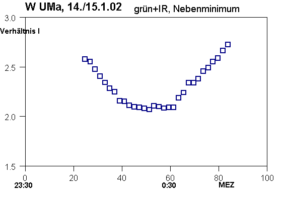 Die erste Minimumbestimmung war eine Überraschung: daß das Minimum ca.10 min früher als vorausgesagt kam,war noch vertretbar,daß aber der Minimumsverlauf einen Bereich konstanter Helligkeit von immerhin 20 min besaß, kam unerwartet. W UMa-Lichtkurven sollten eigentlich in jeder Phase kontinuierlich verlaufen.Ausnahme: Unterklasse 'W'[2].Dieser Sachverhalt wird erst bei entsprechender Darstellung der Zeitachse sichtbar.